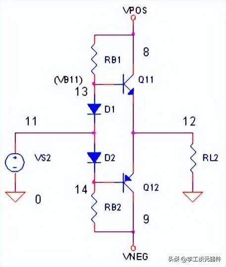 这里需要一种方法来弥补射极跟随器的 0.7 V 损失。这里就要想:哪个组件的导通电压接近 VBE 压降?答案是PN结二极管,下面显示了两个二极管清理死区的示意图。