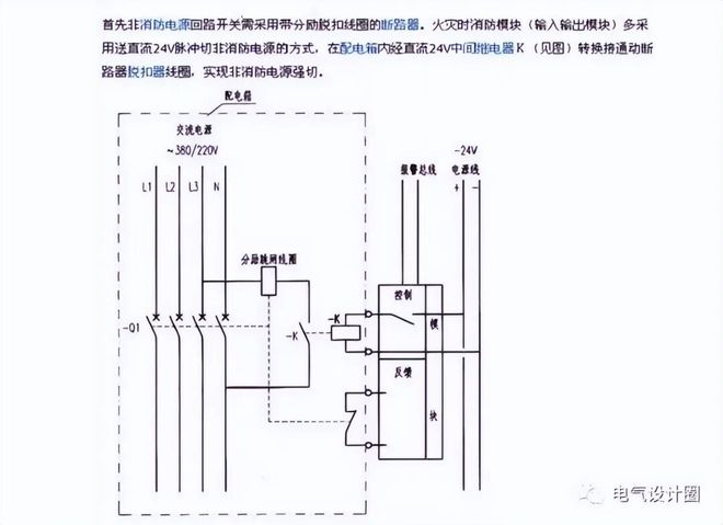 非消防电源空气开关上面安装的是一个电磁分励脱线V电源,并通过输入输出模块常开(接DC24V电源)形成开关量来带DC24V的中间继电器。