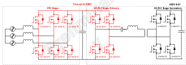 对于三相交流输入的OBC系统,其PFC输出的母线V。在这种情况下,考虑到高耐压与高效率的要求,通常选用SiC MOSFET而非Si IGBT作为开关管。OBC的PFC及与DCDC级的原边侧都需使用SiC MOSFET,如图5所示。图6展示了以400V电压平台,11kW双向OBC为例的系统中SiC MOSFET的使用位置。