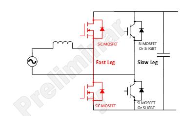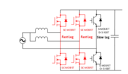 在400V 单相交流输入的OBC DC/DC 系统中,不论是PFC输出的直流母线电压还是OBC整体输出的电池电压,其波动范围都在Si硅基MOSEFT可以承受的电压范围之内。然而,随着对系统功率密度要求的逐步提升,传统二极管整流桥Boost PFC电路不能再满足效率和散热的要求,无桥PFC如图腾柱PFC在逐步成为业界主流。在图腾柱PFC拓扑中,可以利用碳化硅SiC MOSFET高频开关、反向恢复低和导通电阻小的优势,大大提升系统效率和功率密度,如图2所示。