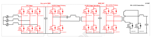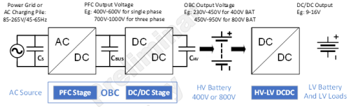 OBC通常分为PFC 和DC/DC两级。PFC级为并网的AC/DC变换器,将输入的单相或三相交流电变换为直流母线电压。受电网基础设置分布的影响,在中国单相交流电桩更为普遍,而在国外其它区域如欧洲,三相交流充电在逐渐成为主流。对于单相交流输入的PFC,其输出直流母线V,而对于三相输入的PFC,其输出直流母线V。由于单级PFC输出的直流电流有比较大的低频波动,所以典型的OBC系统在PFC级后还有会DC/DC变换器级,其输出给车载高压动力电池供电。对于常见的400V或800V电池系统,OBC输出电压通常为230-450V与450-900V。