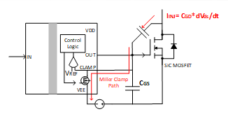 如图11所示,米勒钳位功能主要通过采样栅极的电压并与阈值电压相比较,当栅极电压低于阈值电压后比较器反转,使得内置的米勒钳位MOSFET导通,形成一条低导通阻抗的路径。这条低阻抗路径可以将SiC MOSFET栅极有力关断,从而避免误导通。
