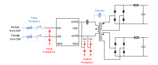 ● 首先,这种方式需要MCU或DSP提供驱动的输入信号,而辅源供电部分与主控芯片信号电路部分通常距离较远,走线较长。输入走线上寄生的电感和电阻容易在芯片输入管脚耦合噪声,超过芯片输入规格要求,需要增加额外的输入侧防护。